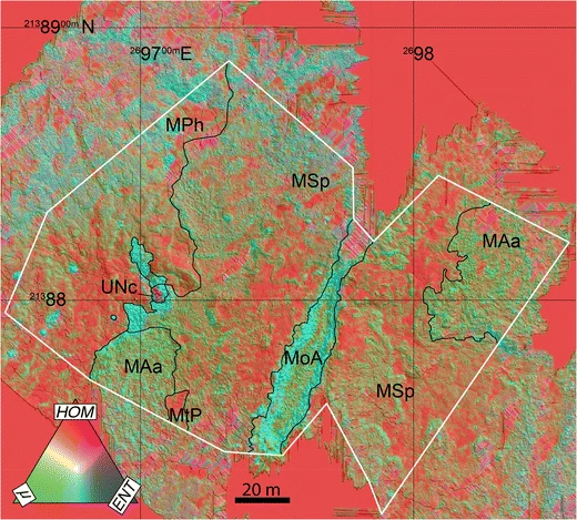 In this map, of the Muliwai a Pele Lava Channel, Mauna Ulu, Hawai‘i, the lava is colorized by its LiDAR roughness. The central lava channel (MoA) had fast moving lava that is very rough (green) while other parts of the lava flow (MPh) had slow moving smooth (red and purple) pāhoehoe lava.